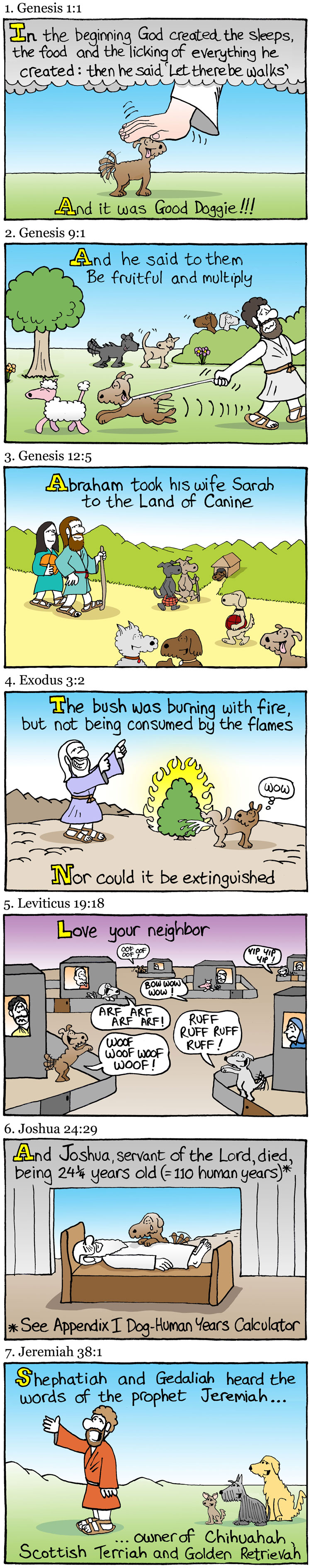 What our dogs would tell us about themselves, if they could use the Bible as a template. I was inspired to combine some new cartoons with earlier cartoons.