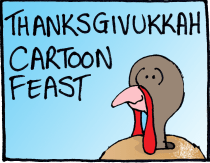 Since overeating is de rigeur for these two holidays, I decided to overindulge with cartoons – besides, 2070 is the next overlap year, no point leaving any cartoons on the shelf. Happy Holidays to all of you who are celebrating!